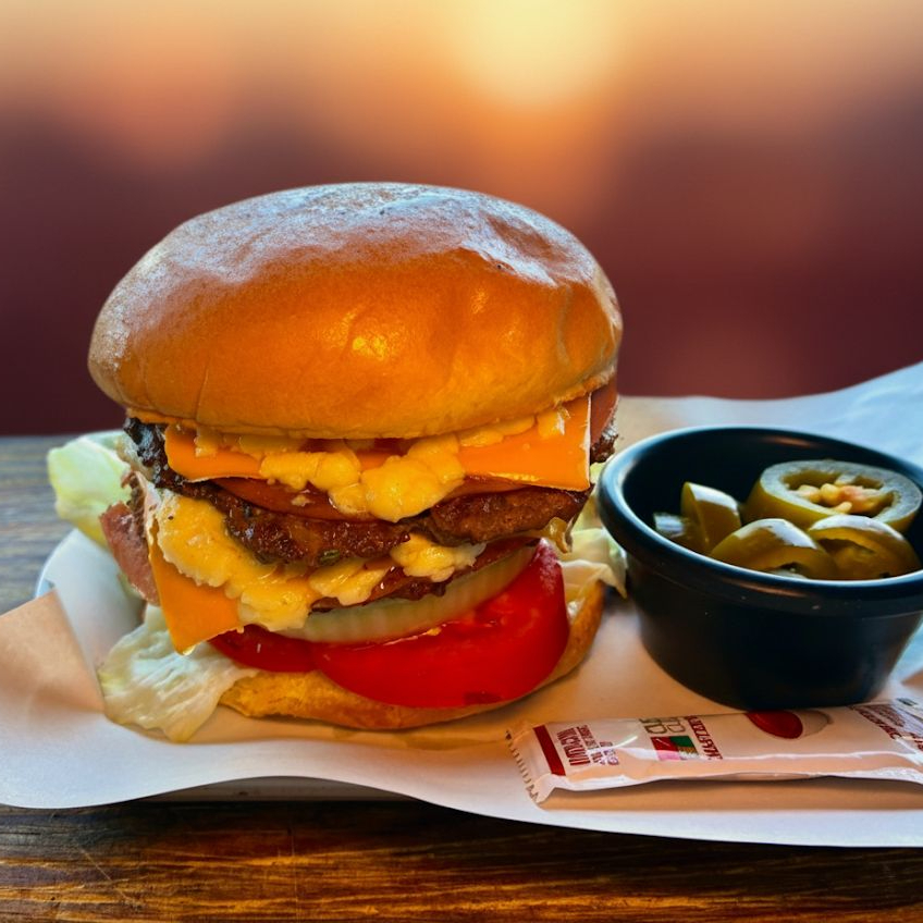Deliciosa hamburguesa carne a elegir, con nuestra base de topping a eleccion acompañado de queso, peperonie, tocino y aderezo ranch