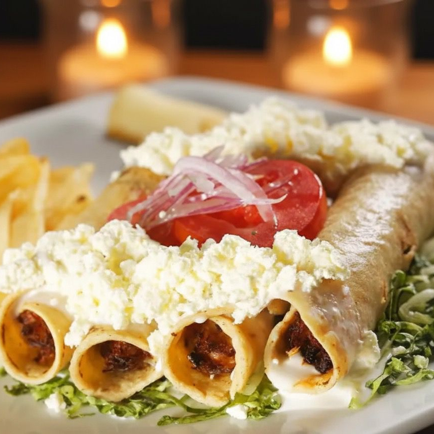 Orden con 5pz de flautas de pollo acompañadas de salsa, crema, ensalada y papas a la francesa