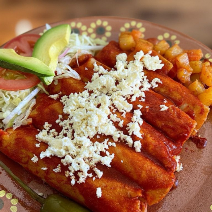 5pz de enchiladas rojas acompañadas de salsa, ensalada y papas a la francesa