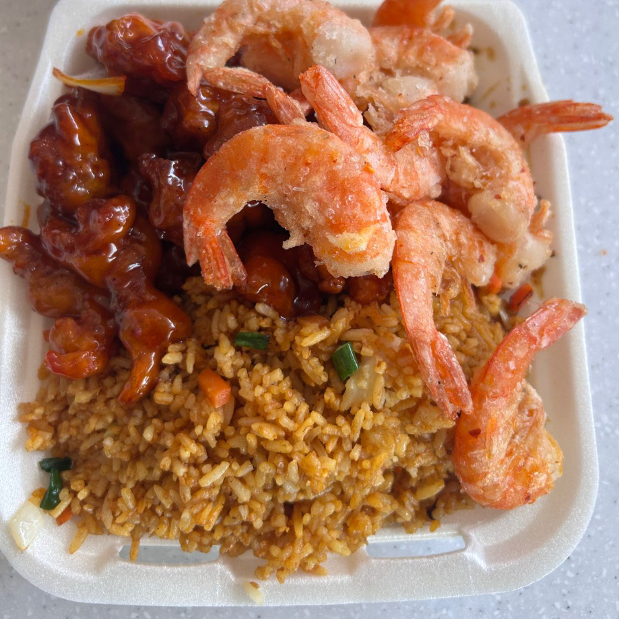 Arroz o pasta con dos guisos diferentes y camarón (400 g aproximadamente entre los guisos y 12 piezas de camarón), (para máximo 2 personas).