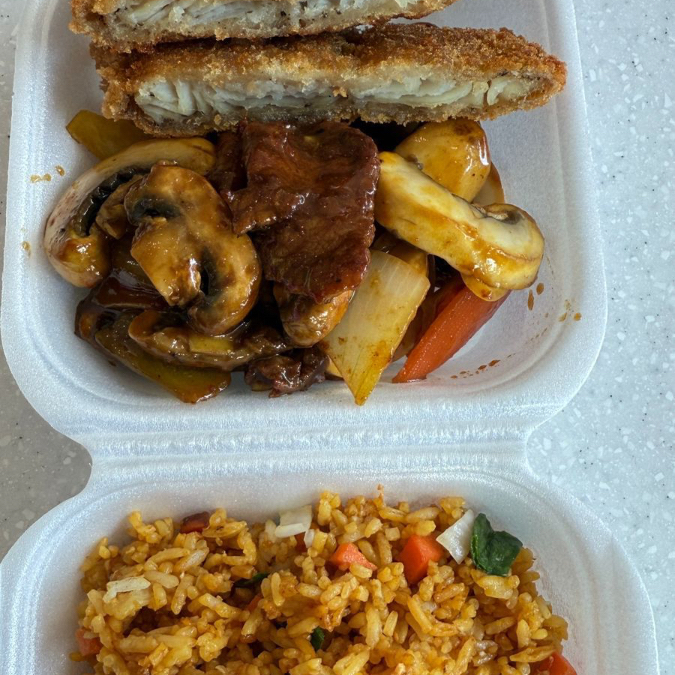 Arroz o pasta con dos guisos diferentes (250 g y 200 g), salsa, picante y agridulce.