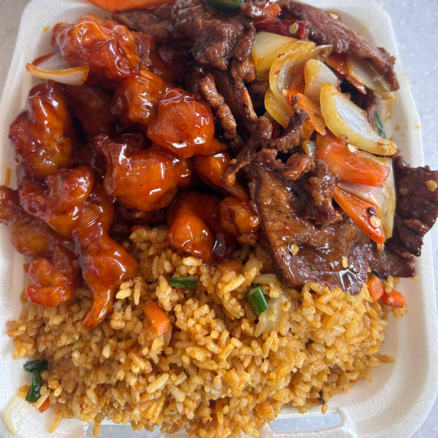 Arroz o pasta con dos guisos diferentes (200 g aproximadamente), salsa picante y agridulce, (porción personal).