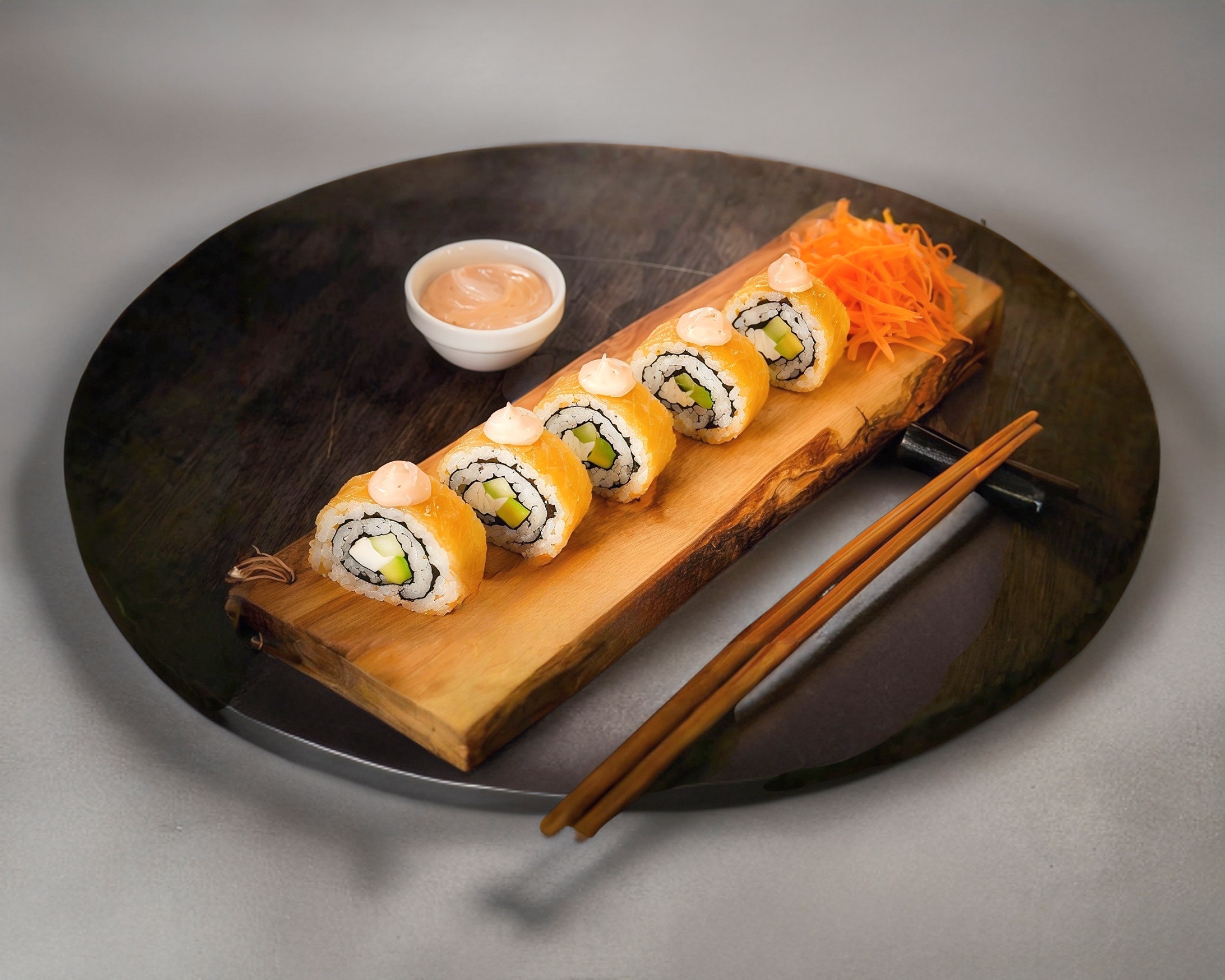 2 Rollos de sushi cubierta de alga relleno de camarón, apio, zanahoria, queso y pollo.