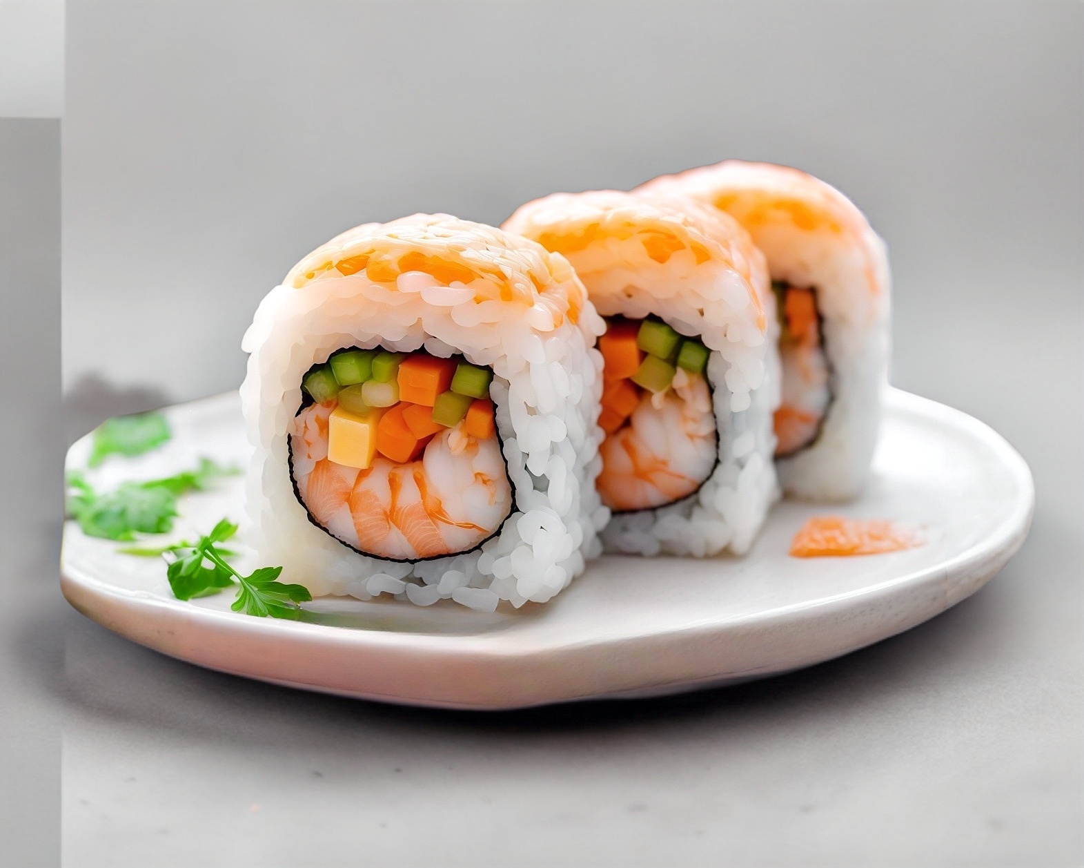 Rollo de sushi cubierta de alga relleno de camarón, apio, zanahoria, queso y pollo.