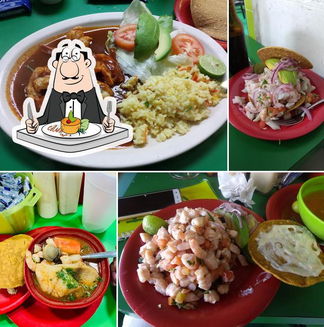 pez, camarón, maíz pozolero, picosito acompañado de lechuga, cebolla, chile serrano