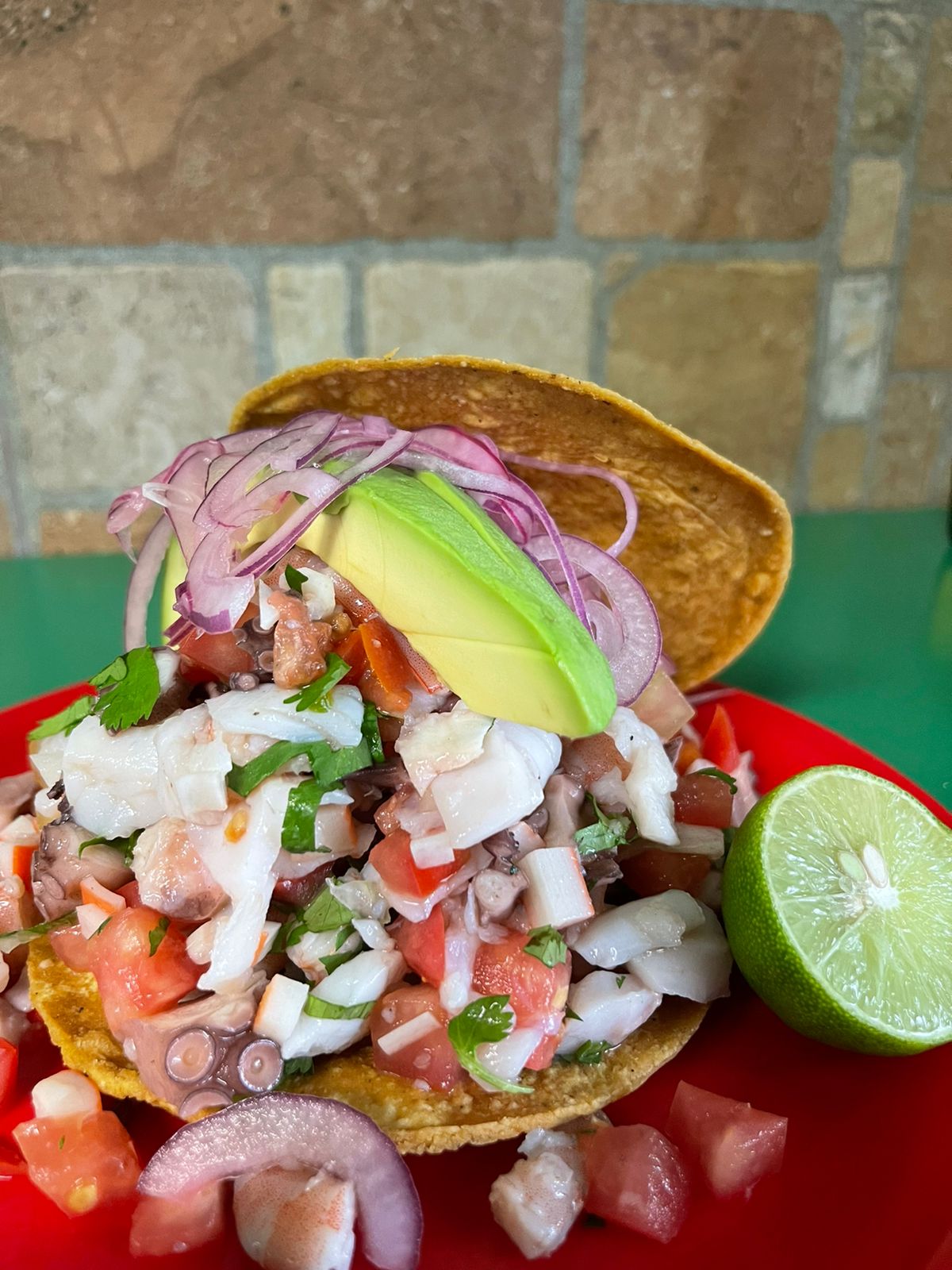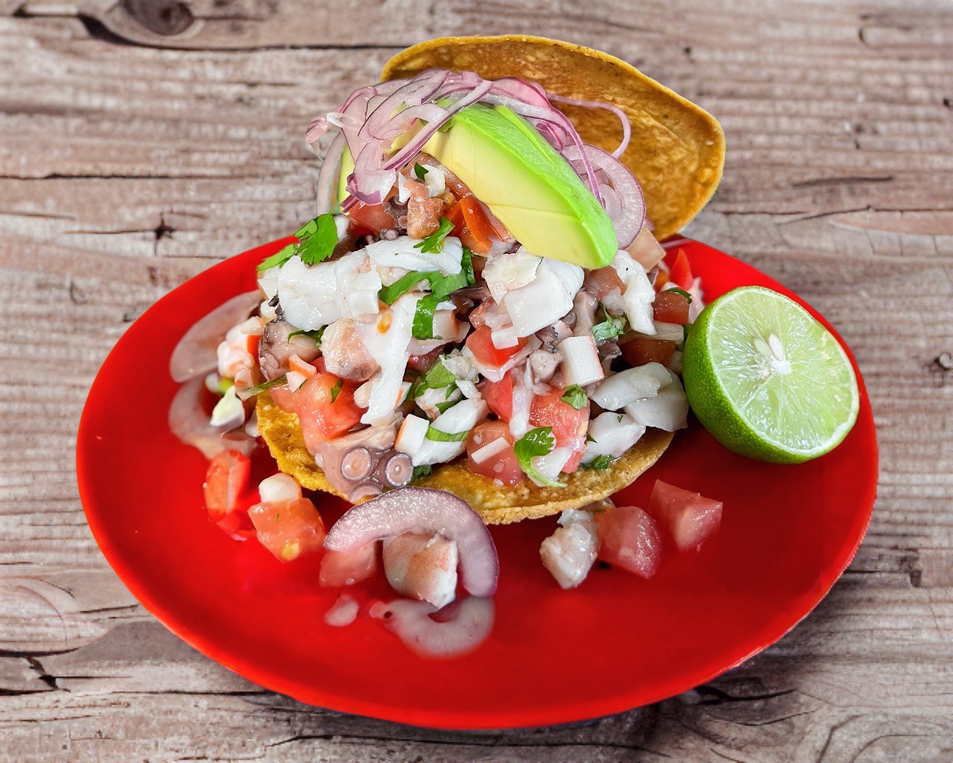 Tostada de pulpo, camarón surimi y pez