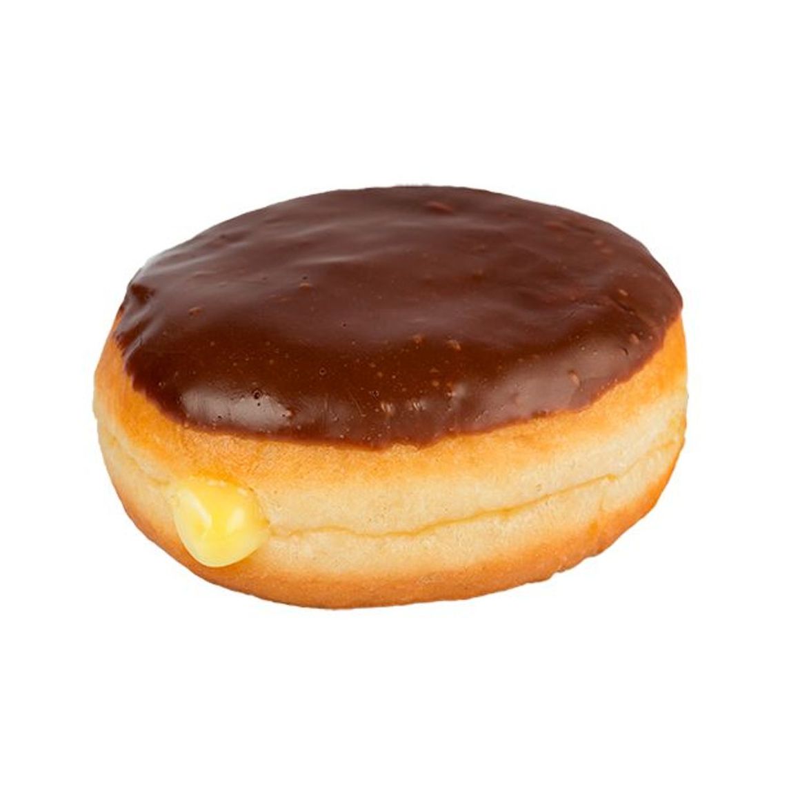 Esponjosa y suave dona de masa tradicional rellena de crema veneciana cubierta de fondant de chocolate.