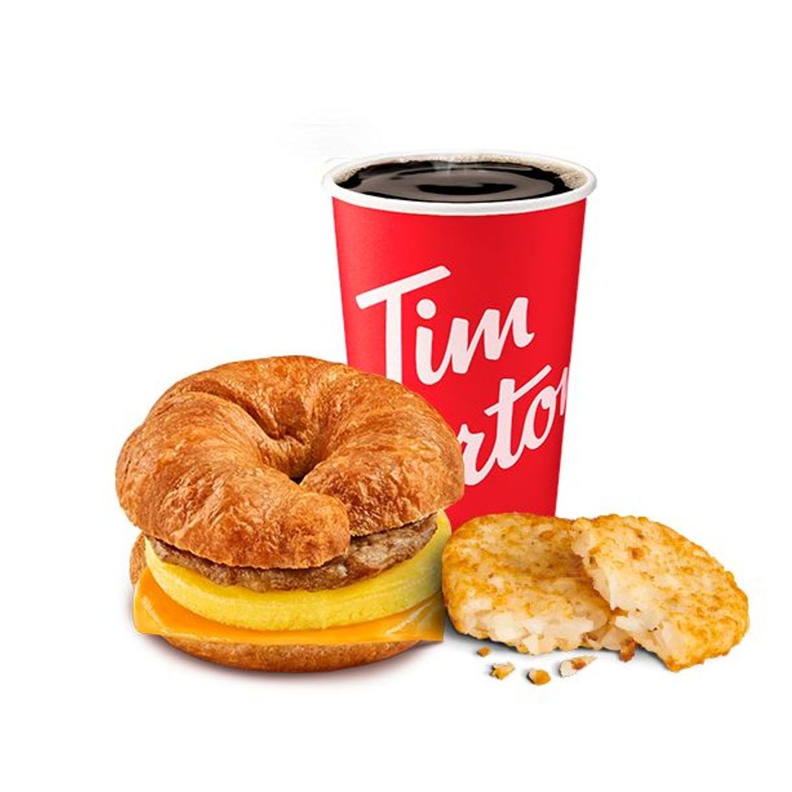 Inigualable sándwich con un Croissant esponjoso, calientito y recién horneado con torta de huevo, queso derretido tipo cheddar y salchicha. Acompañado de papa hashbrown y café mediano.