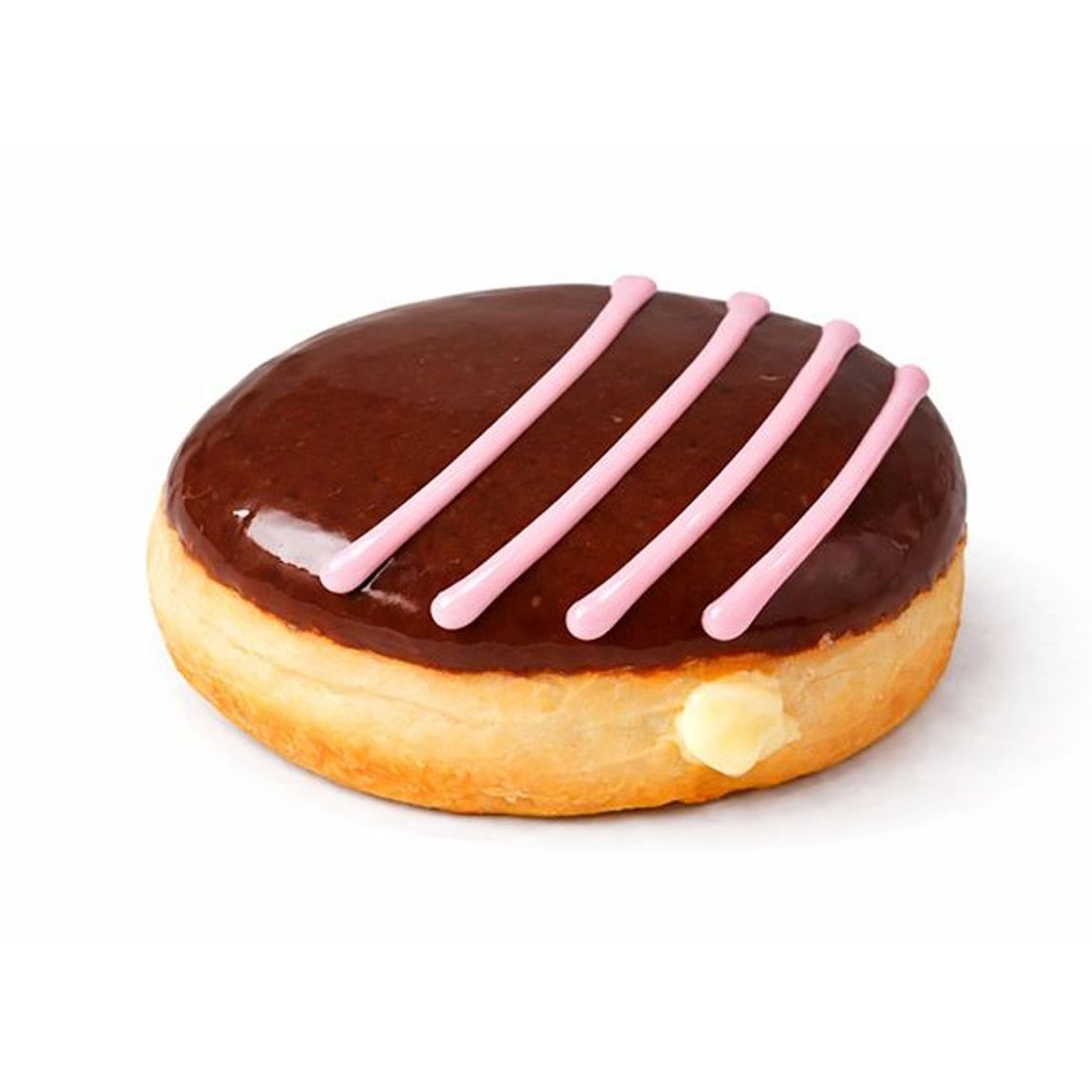 Dona rellena de crema veneciana, cubierta de chocolate. Su interior cremoso conquista desde el primer bocado y se corona con líneas de fresa que le dan un toque dulce.