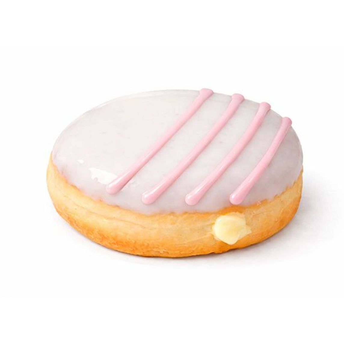 Dona rellena de crema veneciana, cubierta de vainilla. Su interior cremoso conquista desde el primer bocado y se corona con líneas de fresa que le dan un toque dulce.