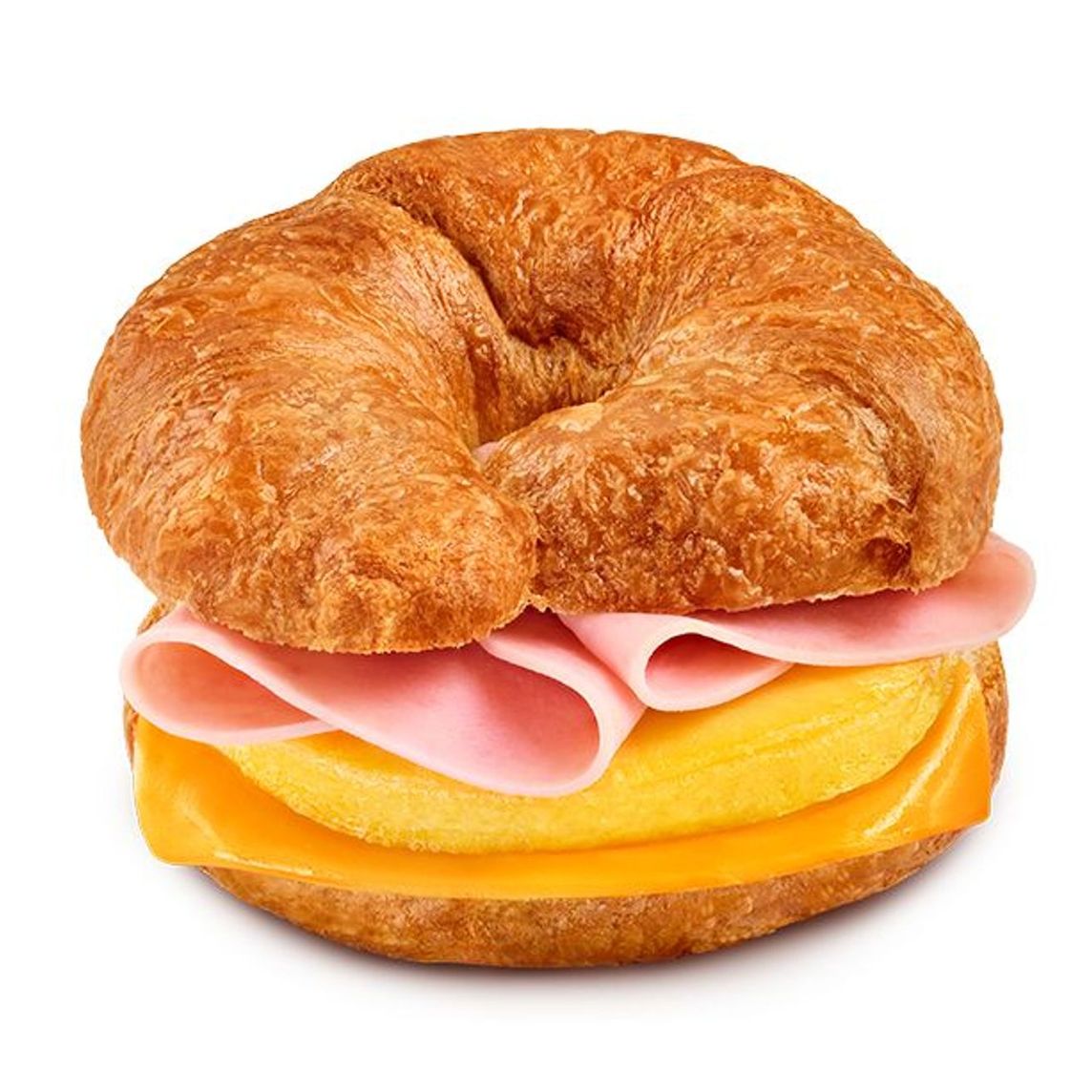 Inigualable sándwich con un Croissant esponjoso, calientito y recién horneado con torta de huevo, queso derretido tipo cheddar y jamón.