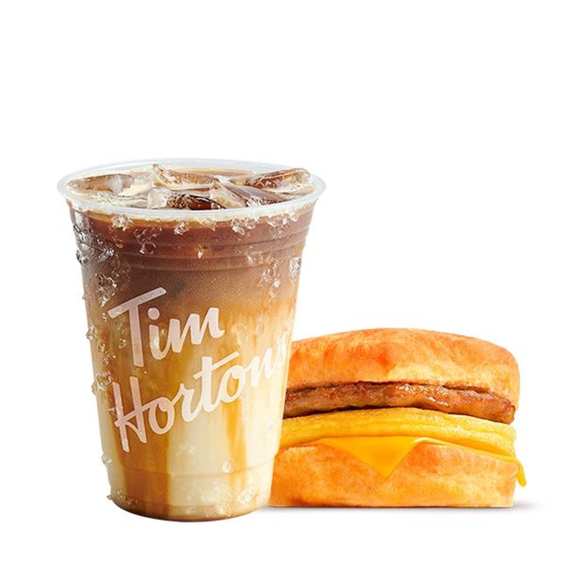 Delicioso, calientito y recién horneado sándwich de Biscuit con torta de huevo, queso derretido tipo cheddar y salchicha. Acompañado de un Caramel Macchiato mediano