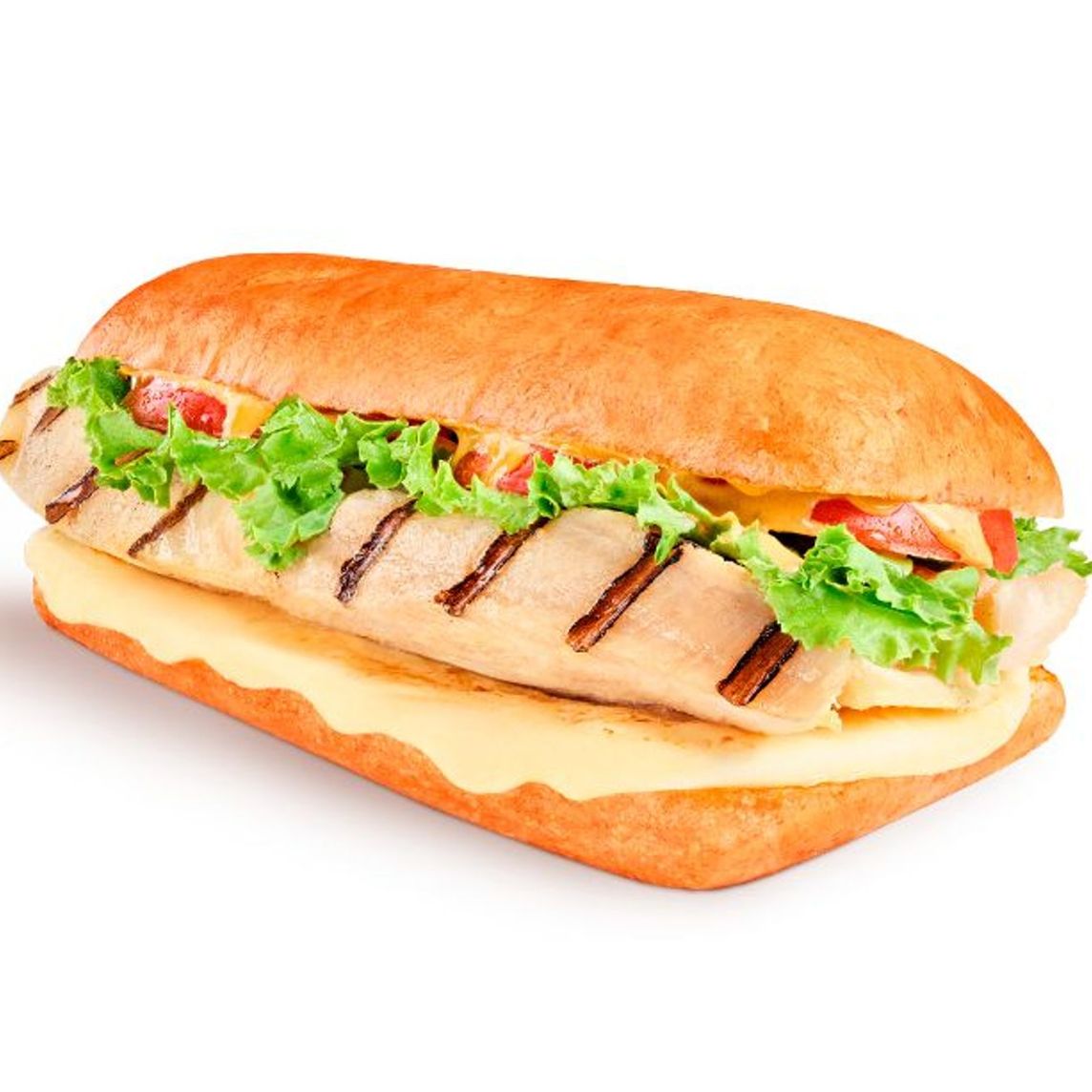 Delicioso sándwich en pan blanco tipo ciabatta con queso mozzarella, pollo a la plancha; lechuga, tomate, cebolla y la famosa mayonesa chipotle. Acompañado con papas gajo y nuestro clásico Té Helado.