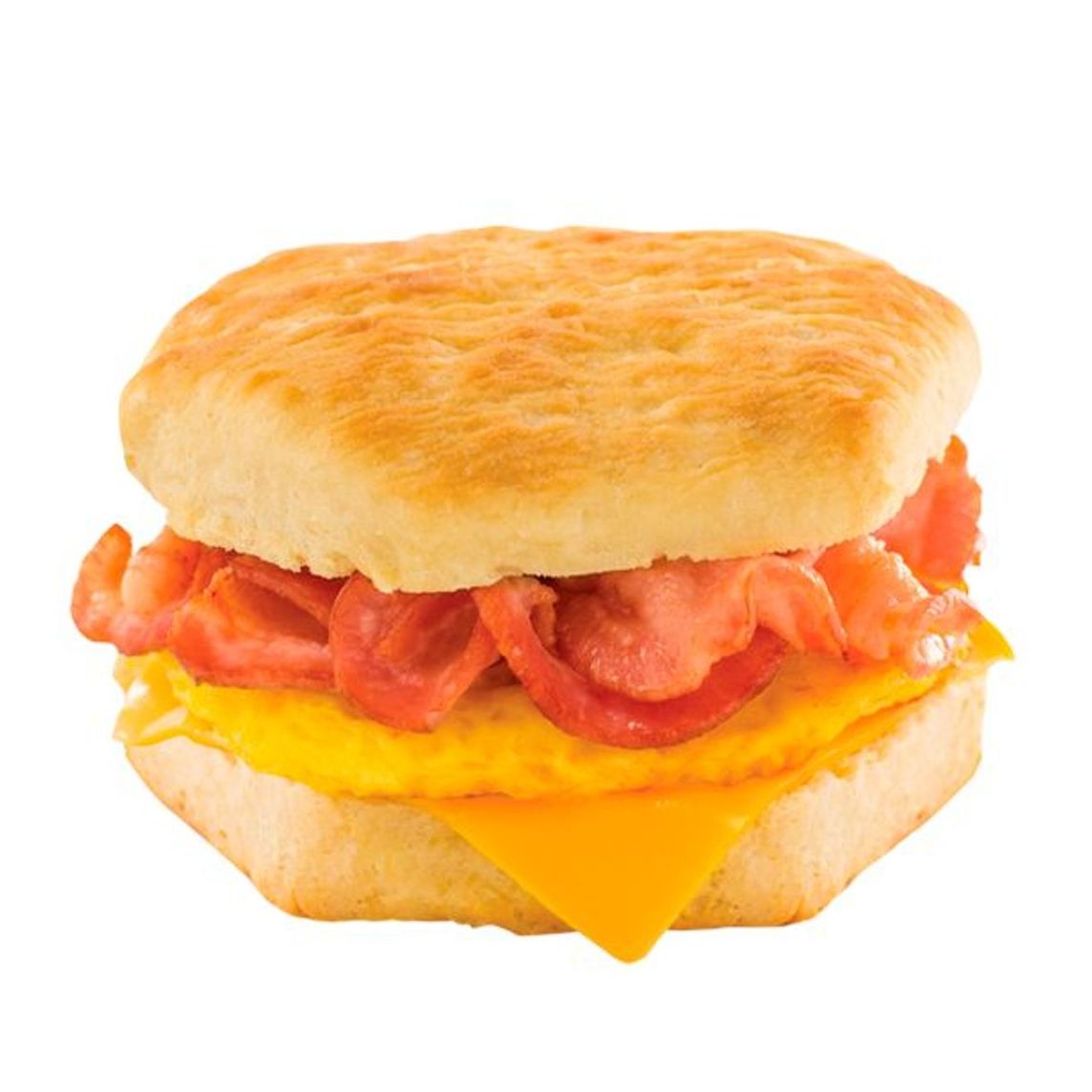 Delicioso, calientito y recién horneado sándwich de Biscuit con torta de huevo, queso derretido tipo cheddar y tocino.