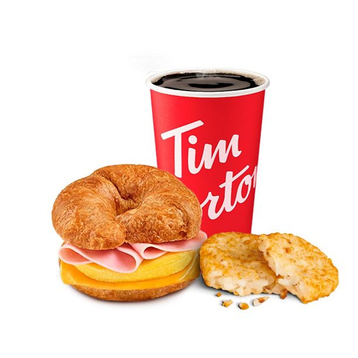 Inigualable sándwich con un Croissant esponjoso, calientito y recién horneado con torta de huevo, queso derretido tipo cheddar y jamón. Acompañado de papa hashbrown y café mediano.