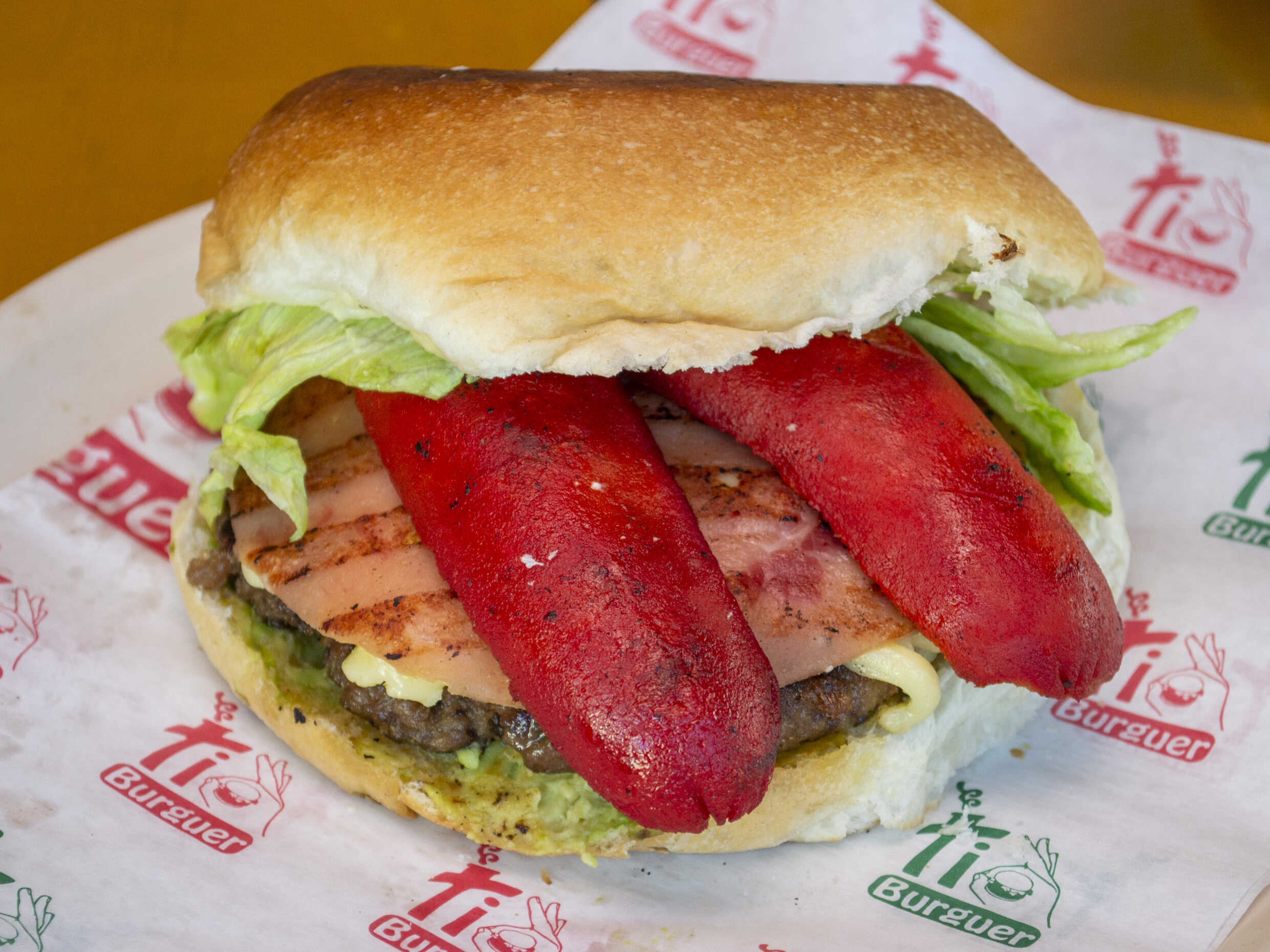 Aguacate, queso, jamón, salsa BBQ, mayonesa, mostaza, tomate y lechuga