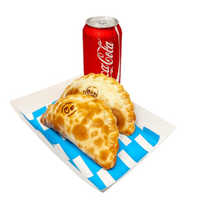 Dos empanadas recién horneadas, crujientes y llenas de sabor, acompañadas de un refresco de la Familia Coca-Cola bien frío