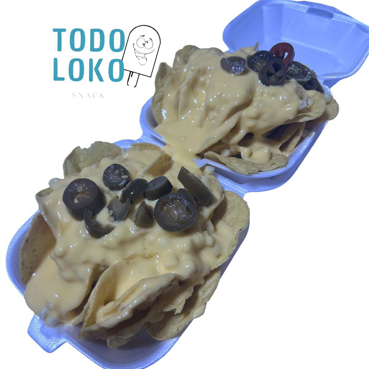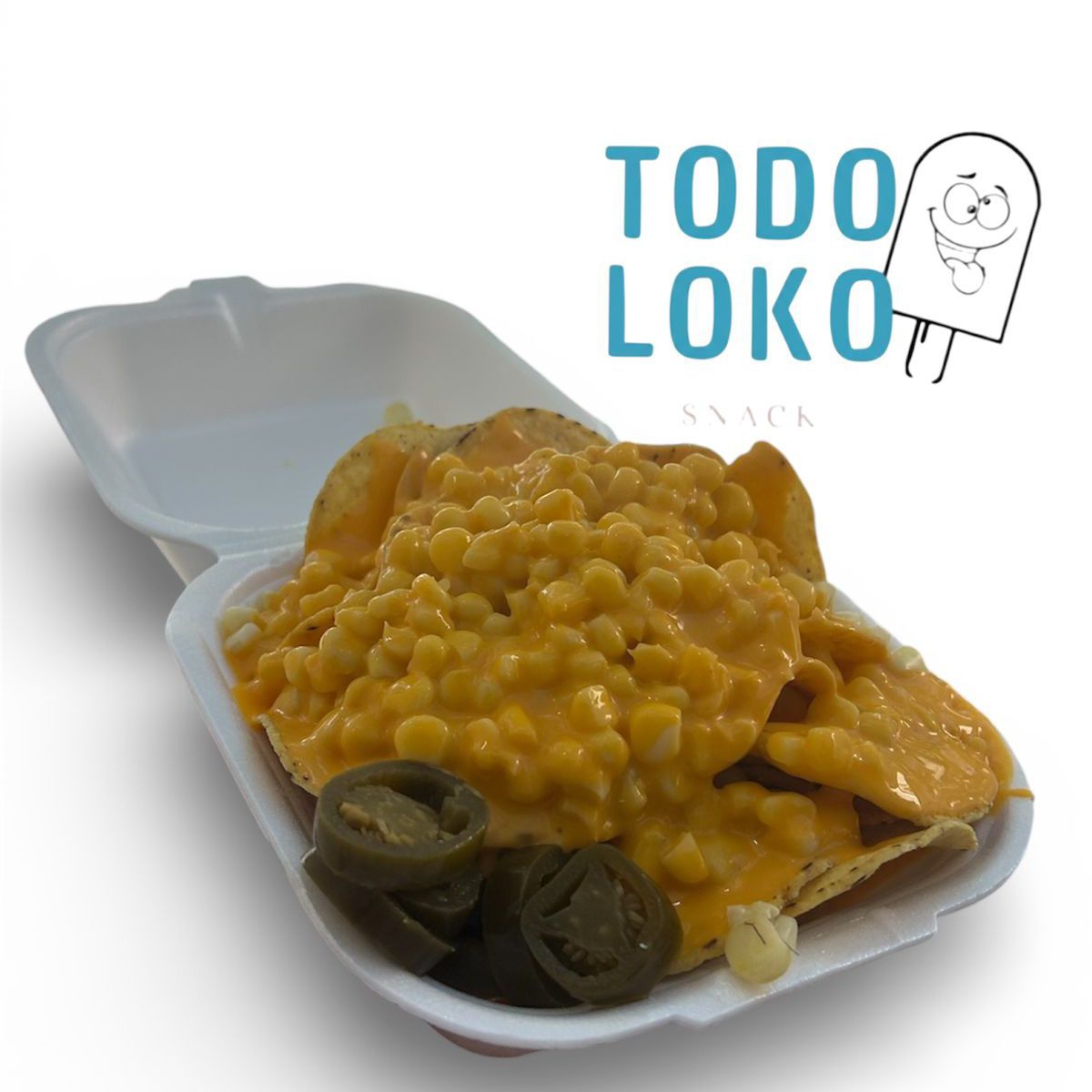 Nachos acompañados de elote, queso amarillo y chile jalapeño.