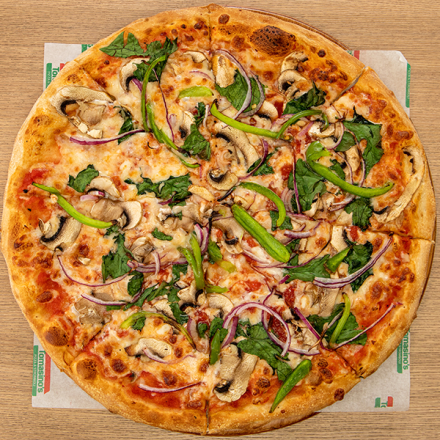 (Grande) Pizza con masa 100% natural (sin conservadores), con salsa de tomate, queso mozzarella, champiñón, cebolla morada, pimiento verde y espinacas (14 pulgadas).