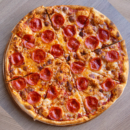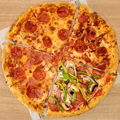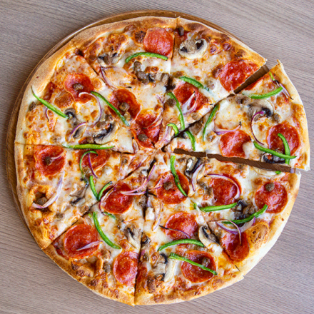 (Grande) Pizza con masa 100% natural, con salsa de tomate, queso mozzarella, pepperoni, pimiento verde, cebolla morada, champiñón y salchicha italiana (14 pulgadas).