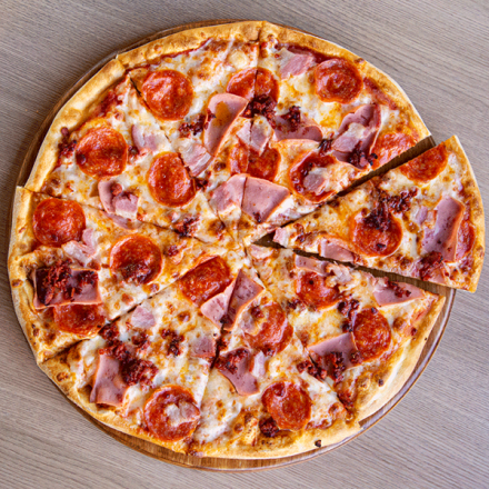 (Grande) Pizza con masa 100% natural, con salsa de tomate, queso mozzarella, pepperoni, jamón, chorizo y tocino (14 pulgadas).
