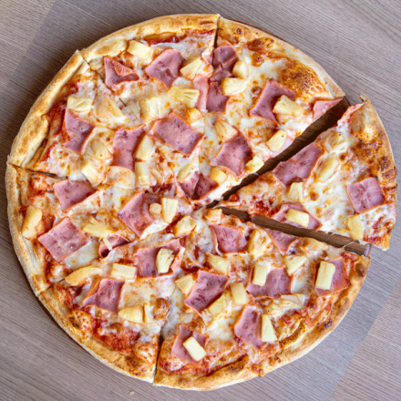 (Grande) Pizza con masa 100% natural (sin conservadores), con salsa 100% de tomate, queso 100% mozarella, jamón y piña (14 pulgadas).