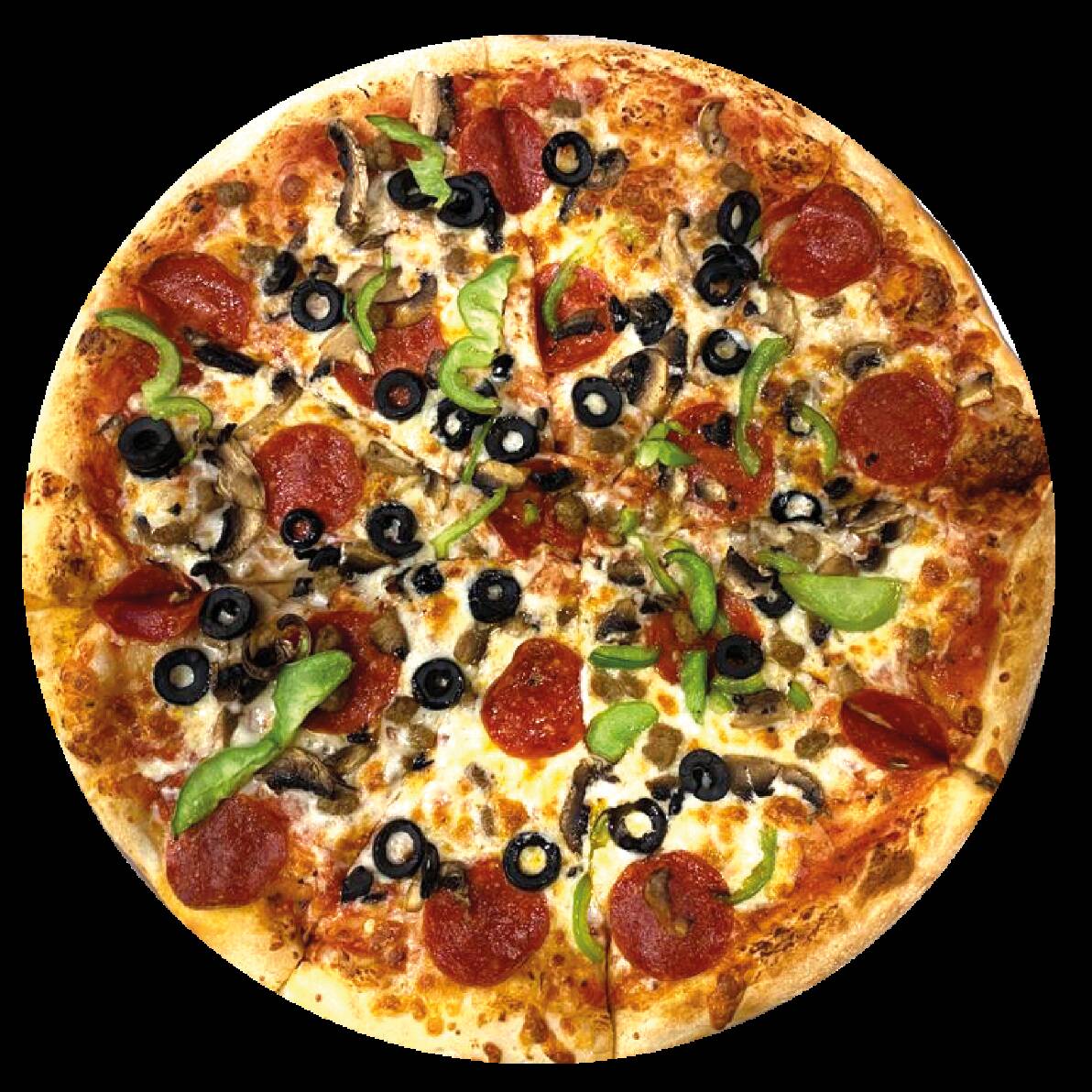 (Grande) Pizza con masa 100% natural, con salsa de tomate, queso mozzarella, pepperoni, salchicha italiana, champiñones y aceitunas (14 pulgadas).