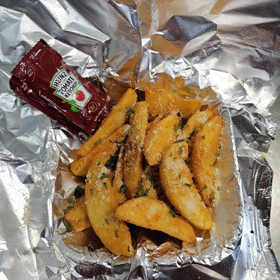 Deliciosas papas en gajo, sazonadas con queso parmesano y perejil acompañadas de cátsup (250 g).
