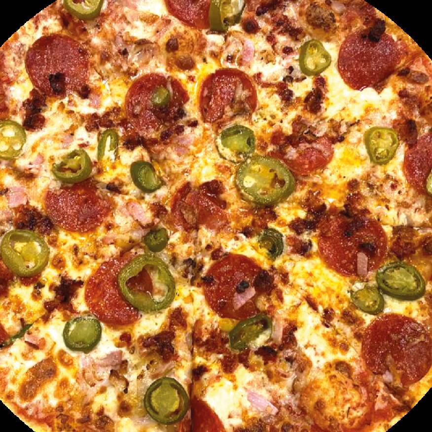 (Grande) Pizza con masa 100% natural, con salsa de tomate, queso mozarella, pepperoni, tocino, chorizo y jalapeño (14 pulgadas).