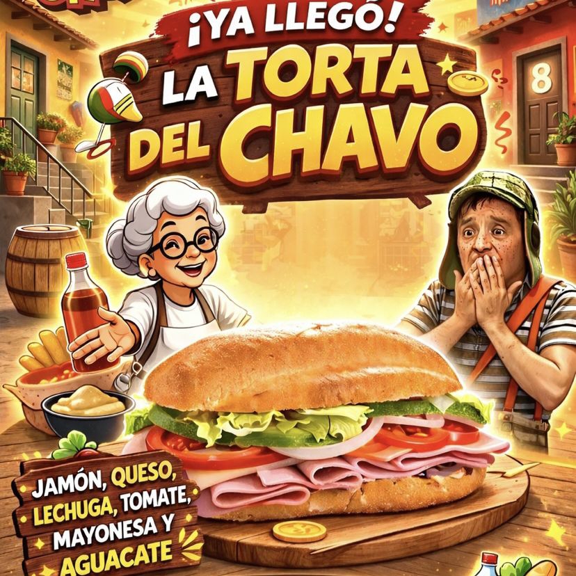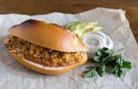 Chicharrón prensado en pan telera con frijoles y complementos.