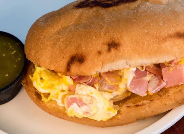 Mezcla de huevo y chorizo en pan telera con frijoles.