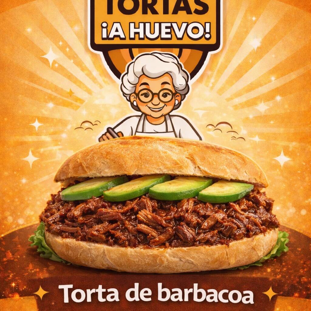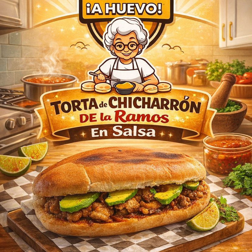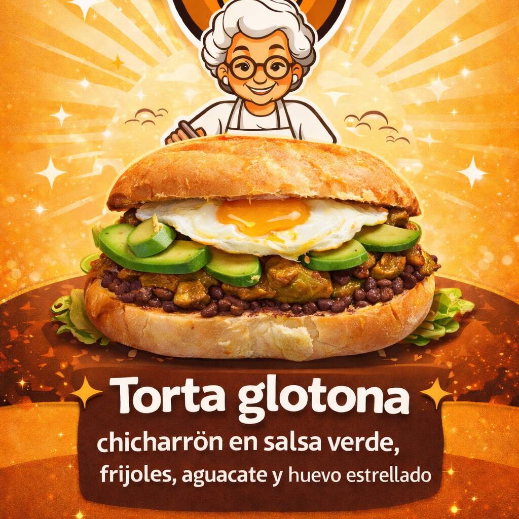 Telera con chicharrón de la Ramos en salsa verde, frijoles, aguacate y un huevo estrellado.