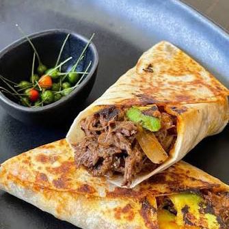 Tortilla de harina grande estilo Sonora con frijoles, aguacate, y barbacoa de res