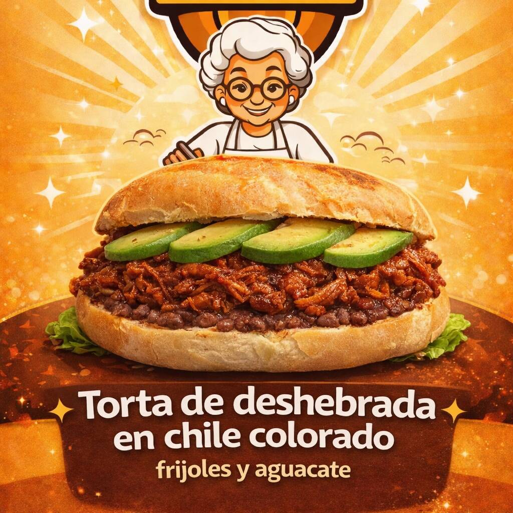 Telera con carne deshebrada de res en chile colorado con frijoles y aguacate