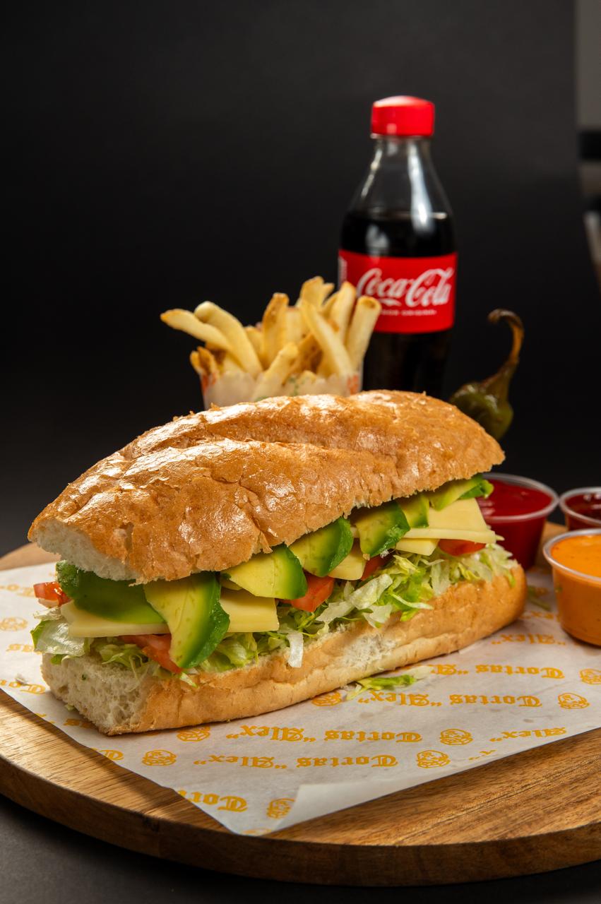Torta Vegetariana con Exquisito Pan de la Casa GRANDE, Abundante Aguacate, Queso Manchego, Lechuga, Tomate, Aguacate y Mayonesa. (Incluye 1 Salsa, 1 Aderezo y 1 Porción de Chile y Zanahoria en Vinagre)