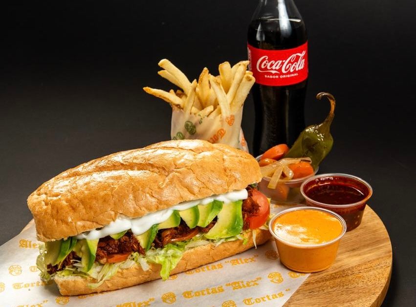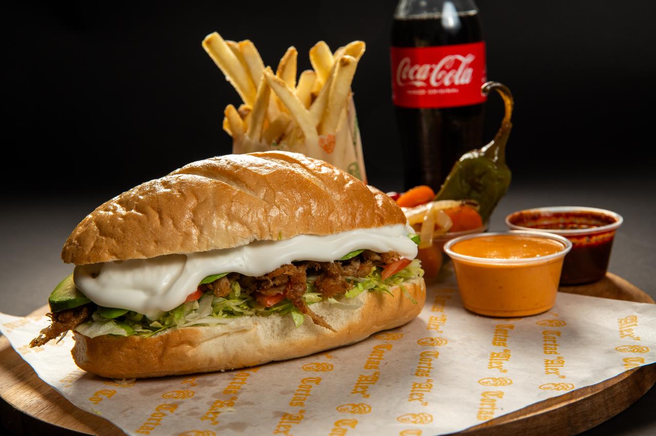 Pan de la Casa GRANDE, Lechuga, Tomate, Carne de Pierna (Puerco), Aguacate y Crema. (Incluye Papas a la Francesa de 150 gr y Refresco) (Incluye 1 Salsa, 1 Aderezo y 1 Porción de Chile y Zanahoria en Vinagre)