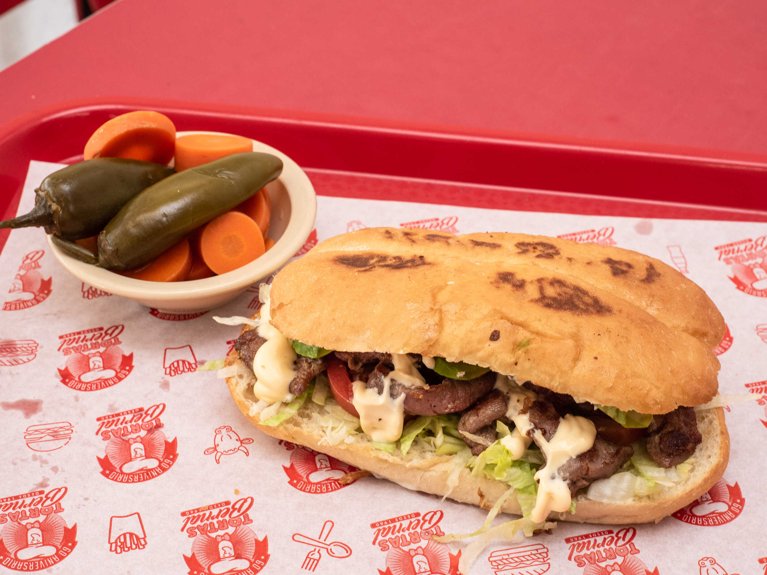 Hamburguesa de res, jamón de pavo, queso manchego, tocino, vegetales y aderezos.