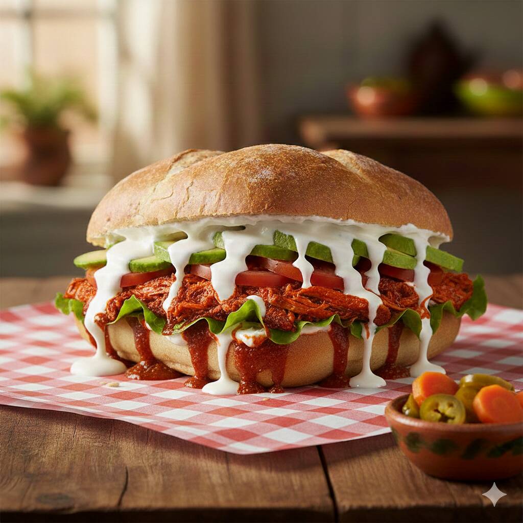 Pierna de puerco deshebrada, con aguacate, lechuga, tomate y crema. combo