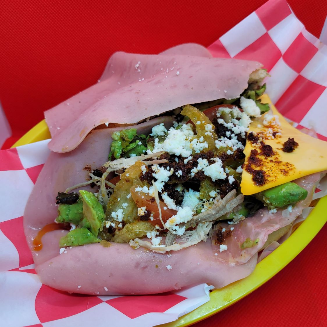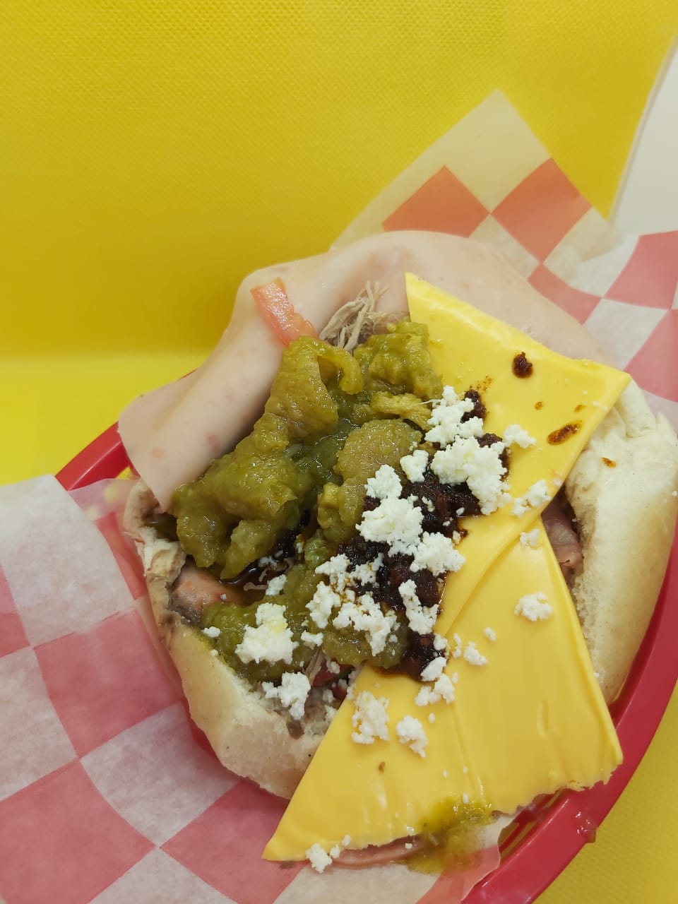 Con comida y salsa extra. Pan francés, frijoles negros, jamón, queso de puerco, queso amarillo, tomate, cebolla, aguacate, chorizo, carne deshebrada, queso blanco y salsa verde de chicharrón.