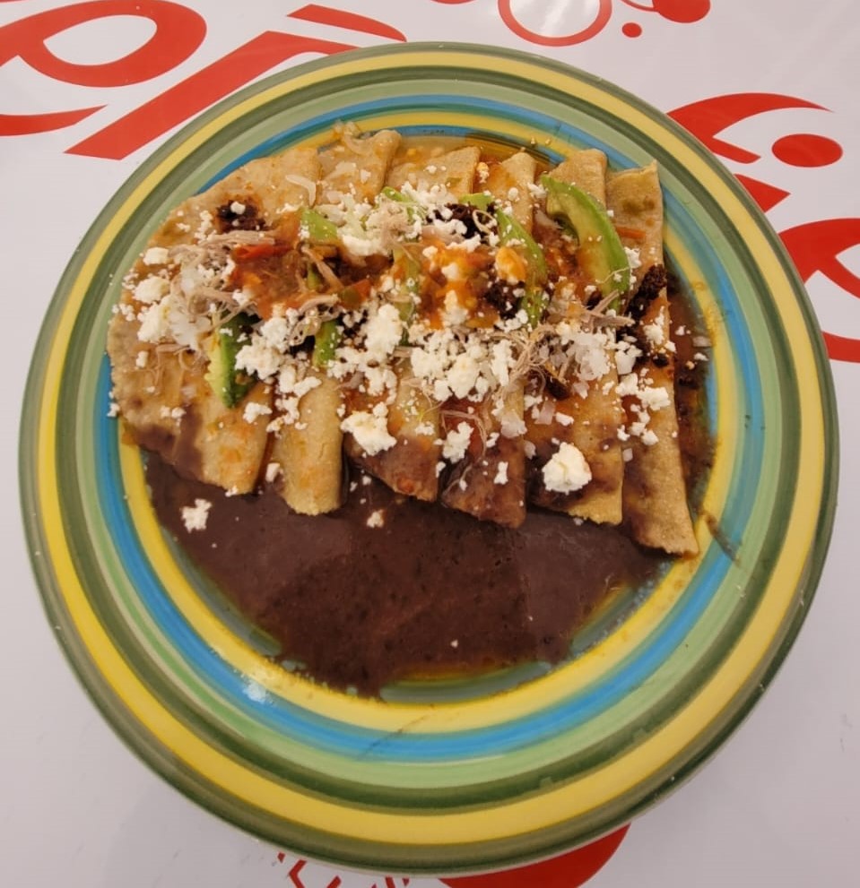 Orden de 5, tortillas hechas a mano, bañadas en salsa roja de tomate, acompañadas con frijoles, cebolla, aguacate, carne deshebrada, chorizo, queso blanco, y salsa verde de chicharrón
