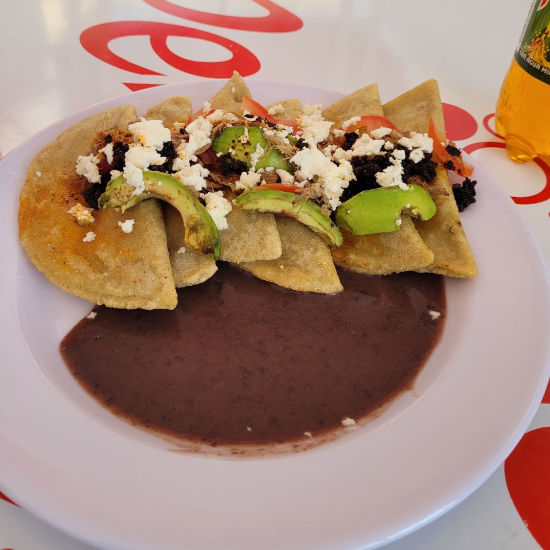 Orden de 5, acompañada de frijoles negros, tomate, cebolla, aguacate, carne deshebrada, queso blanco, chorizo y salsa verde