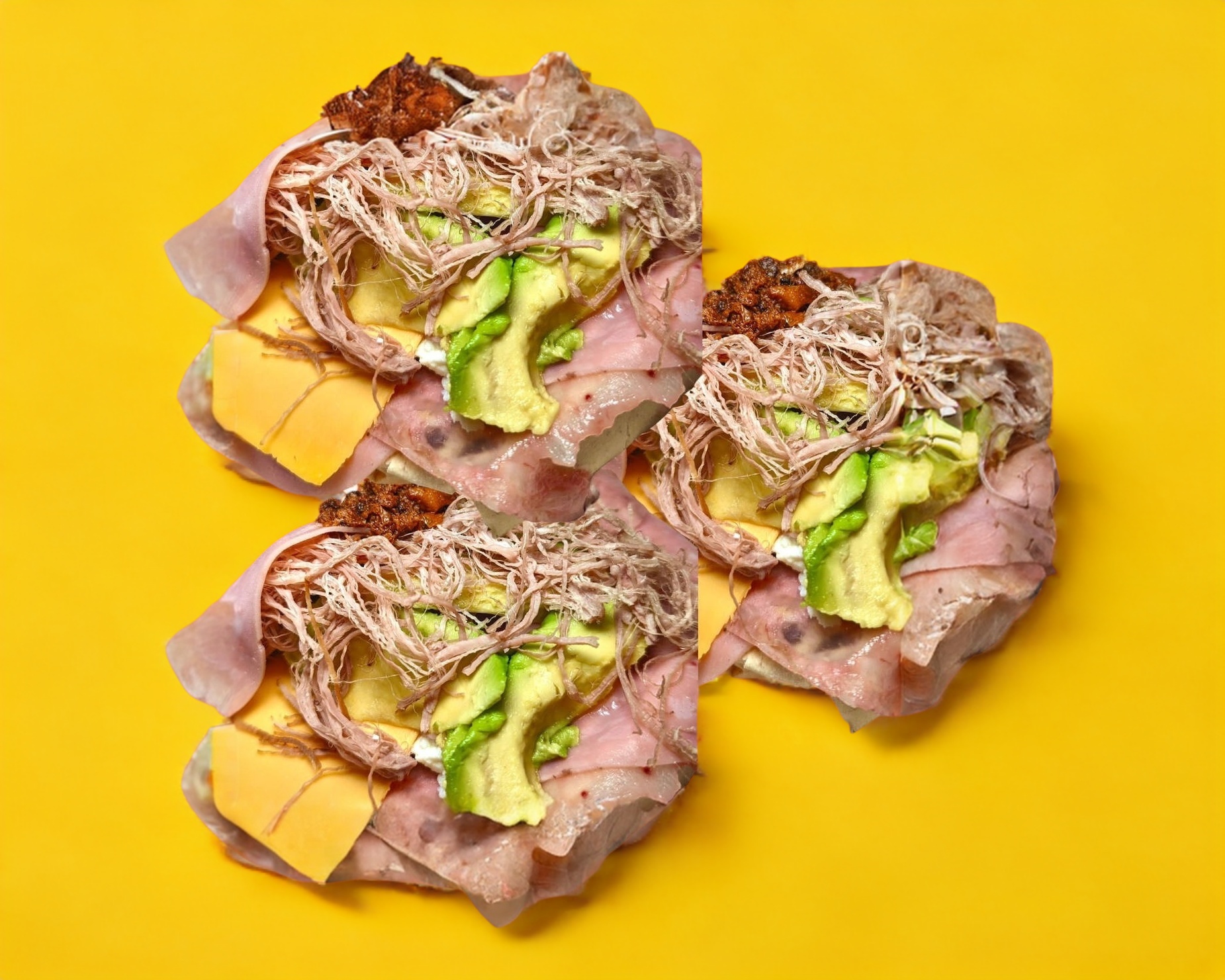Pan frances, frijoles negros, jamon, queso de puerco, queso amarillo, queso blanco fresco, tomate, cebolla, aguacate, carne deshebrada, chorizo, salsa verde con chicharrón
