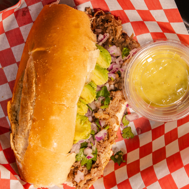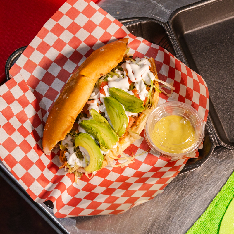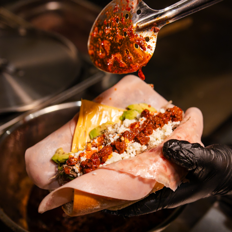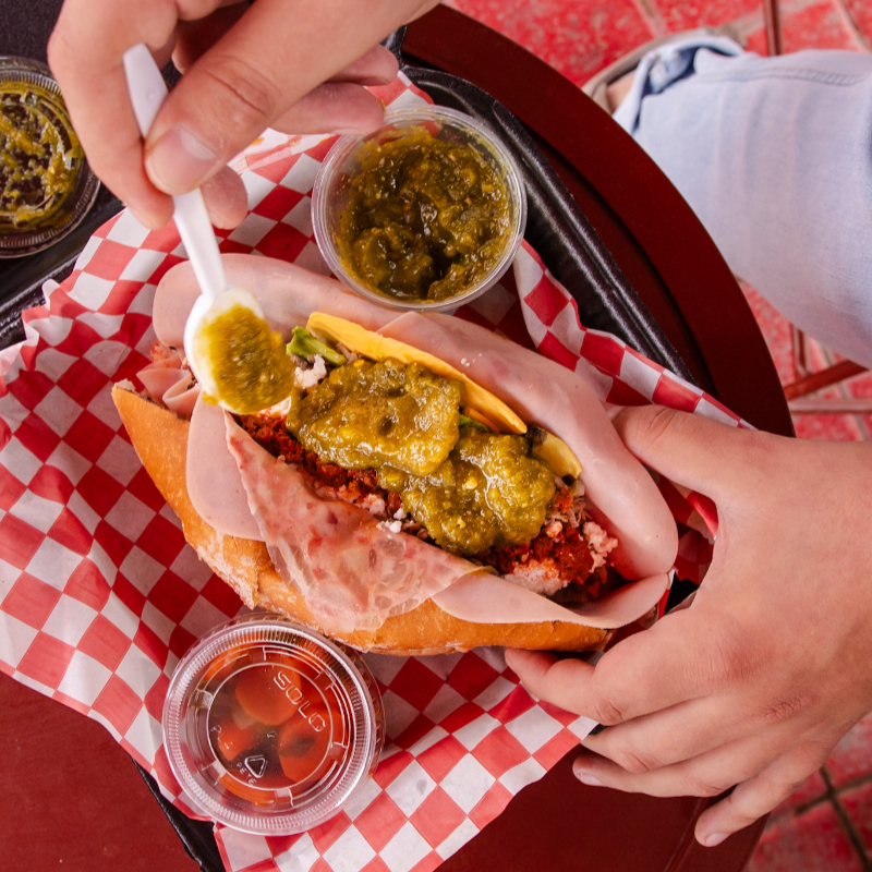Frijol negro, jamón, queso de puerco, queso amarillo, queso fresco, deshebrada de res, chorizo frito, tomate, cebolla, aguacate, (salsa verde con chicharrón aparte).