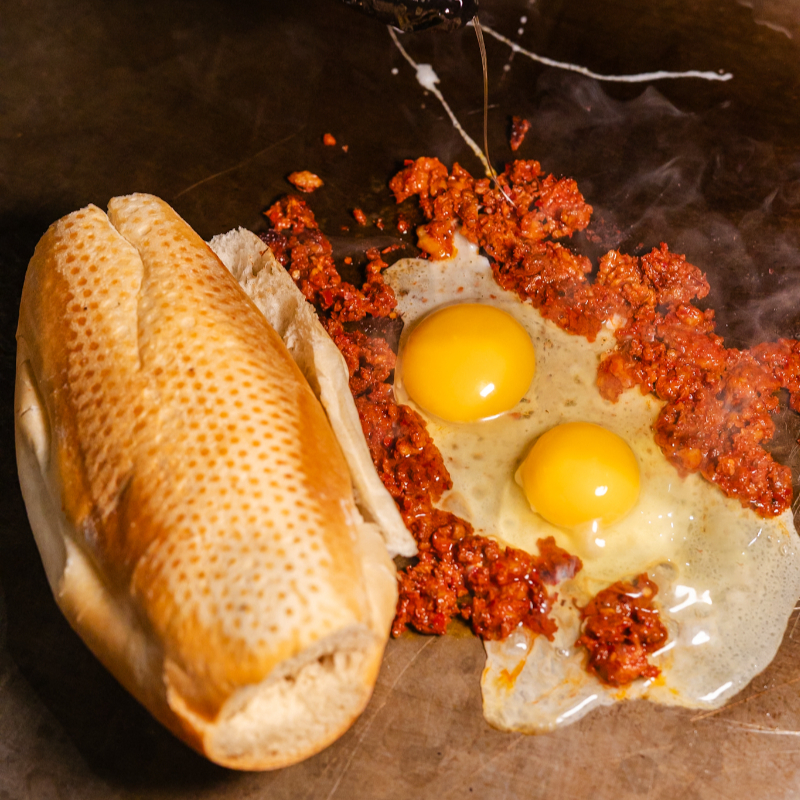 Frijol negro, huevo con chorizo, aguacate, queso fresco.