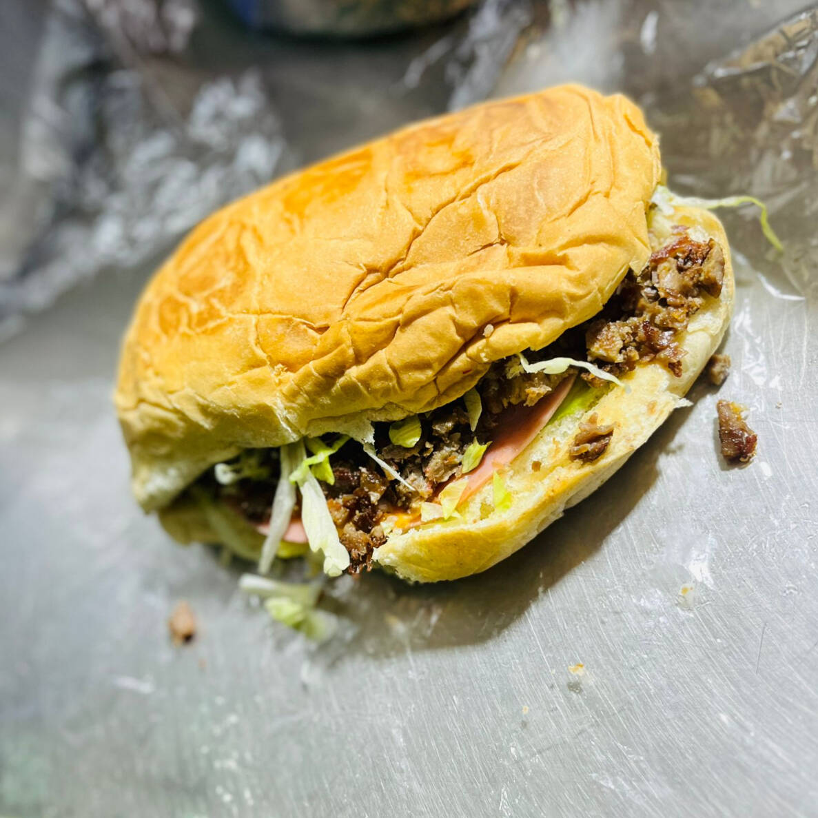 Exquisita torta en telera de un tanto con carne de trompo y res