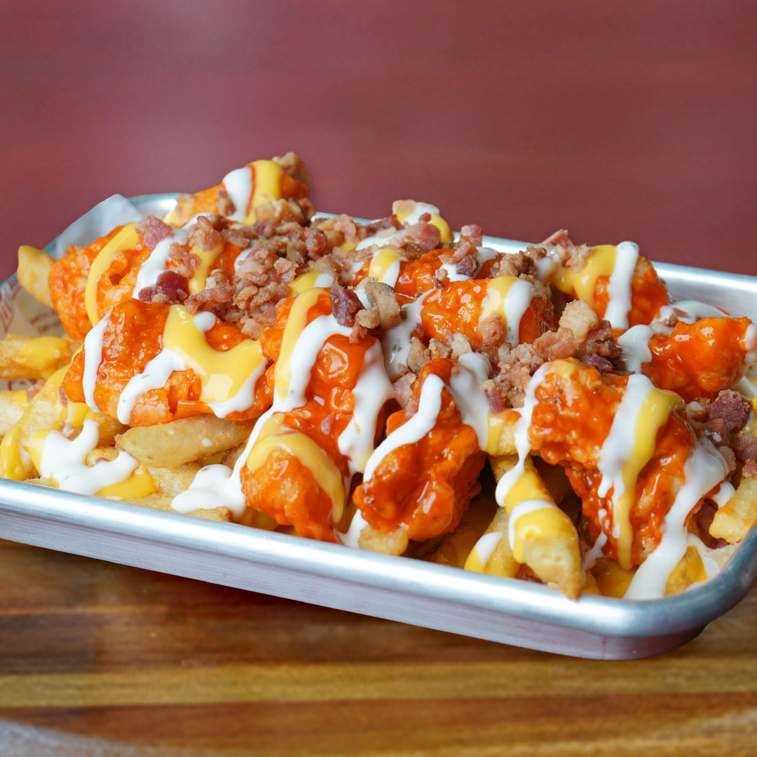 Papas con queso, ranch,boneless buffalo y tocino.