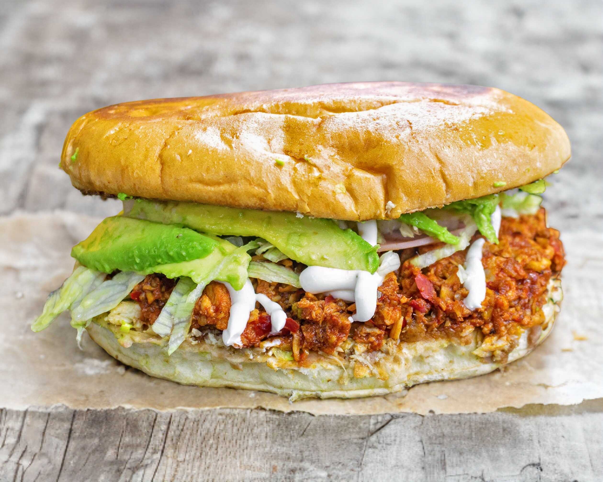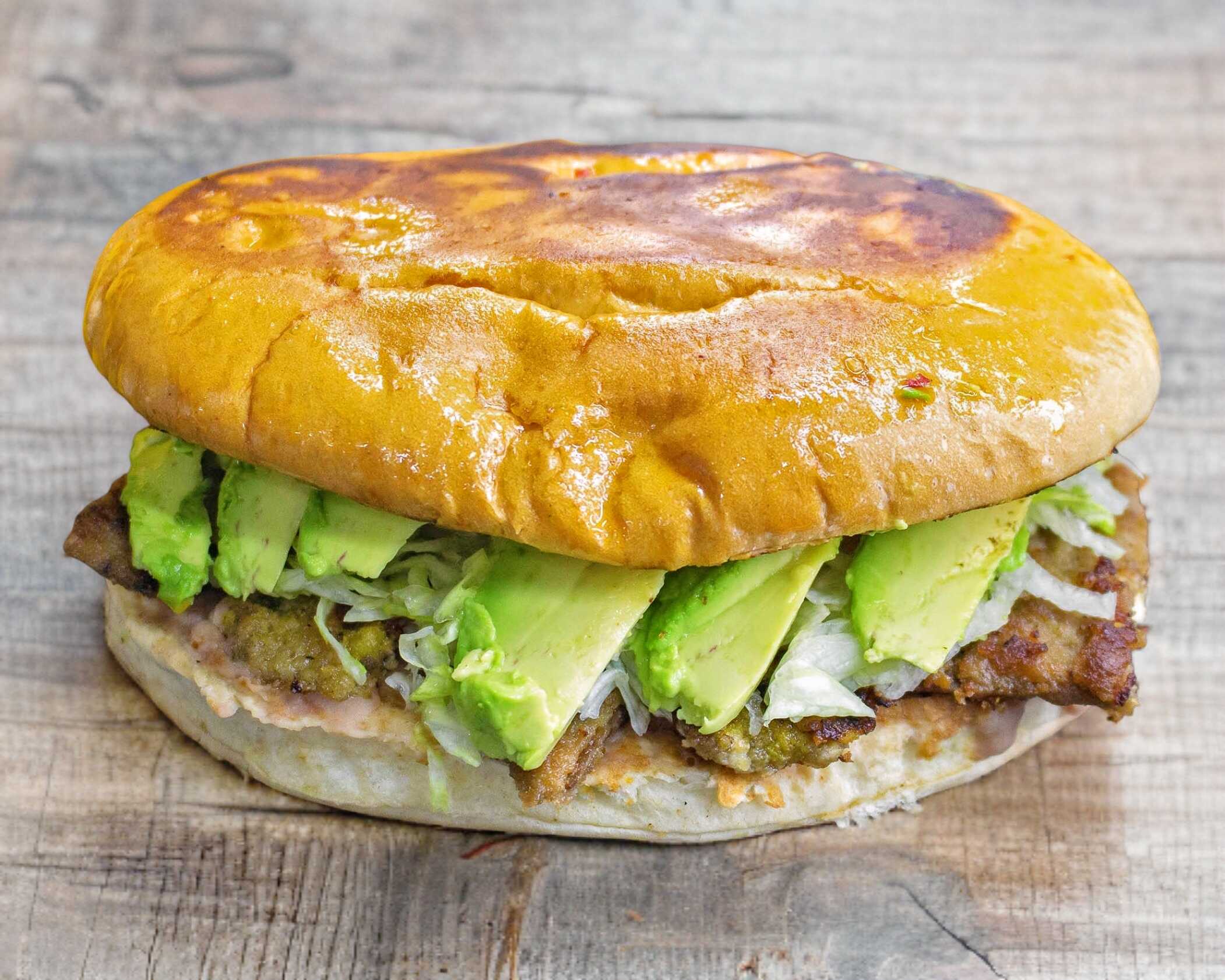 Milanesa, chorizo, frijoles refritos, crema, lechuga, cebolla, tomate y aguacate