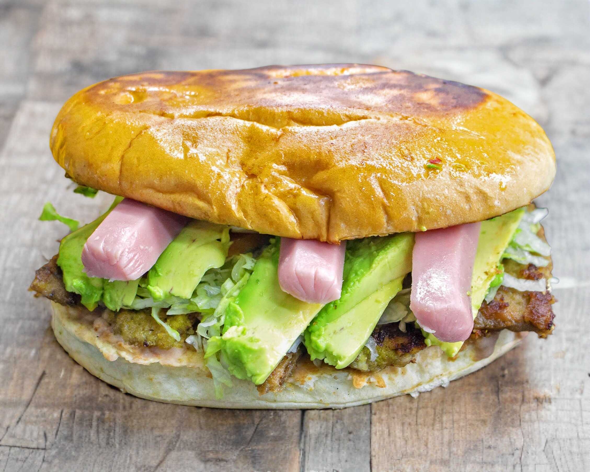 Milanesa de res empanizada, salchicha, frijoles refritos, crema, lechuga, cebolla, tomate y aguacate