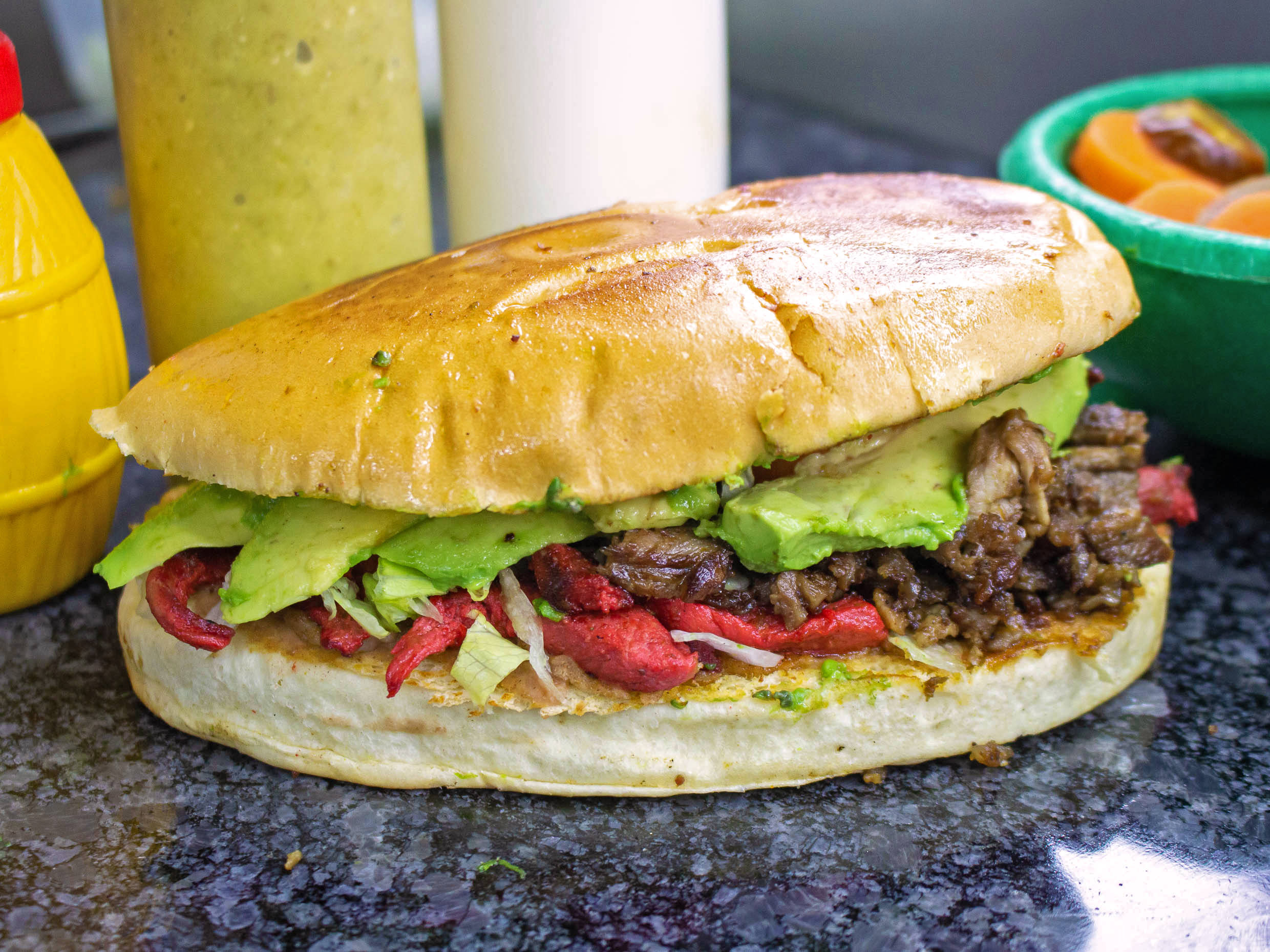 Fríjoles refritos, pierna adobada(120 gramos de adobada), lechuga, tomate, cebolla, aguacate, crema, zanahoria y chiles toreados