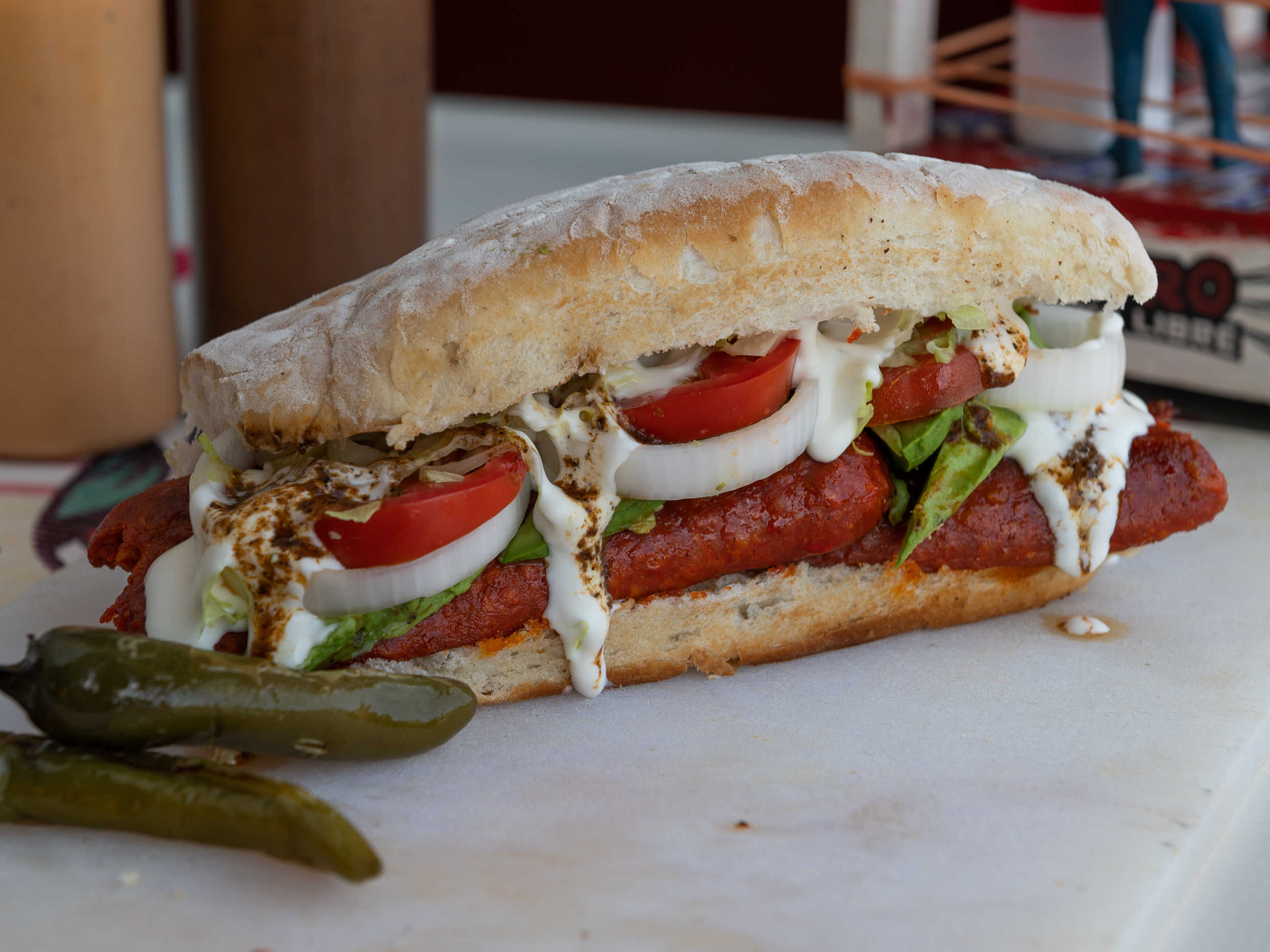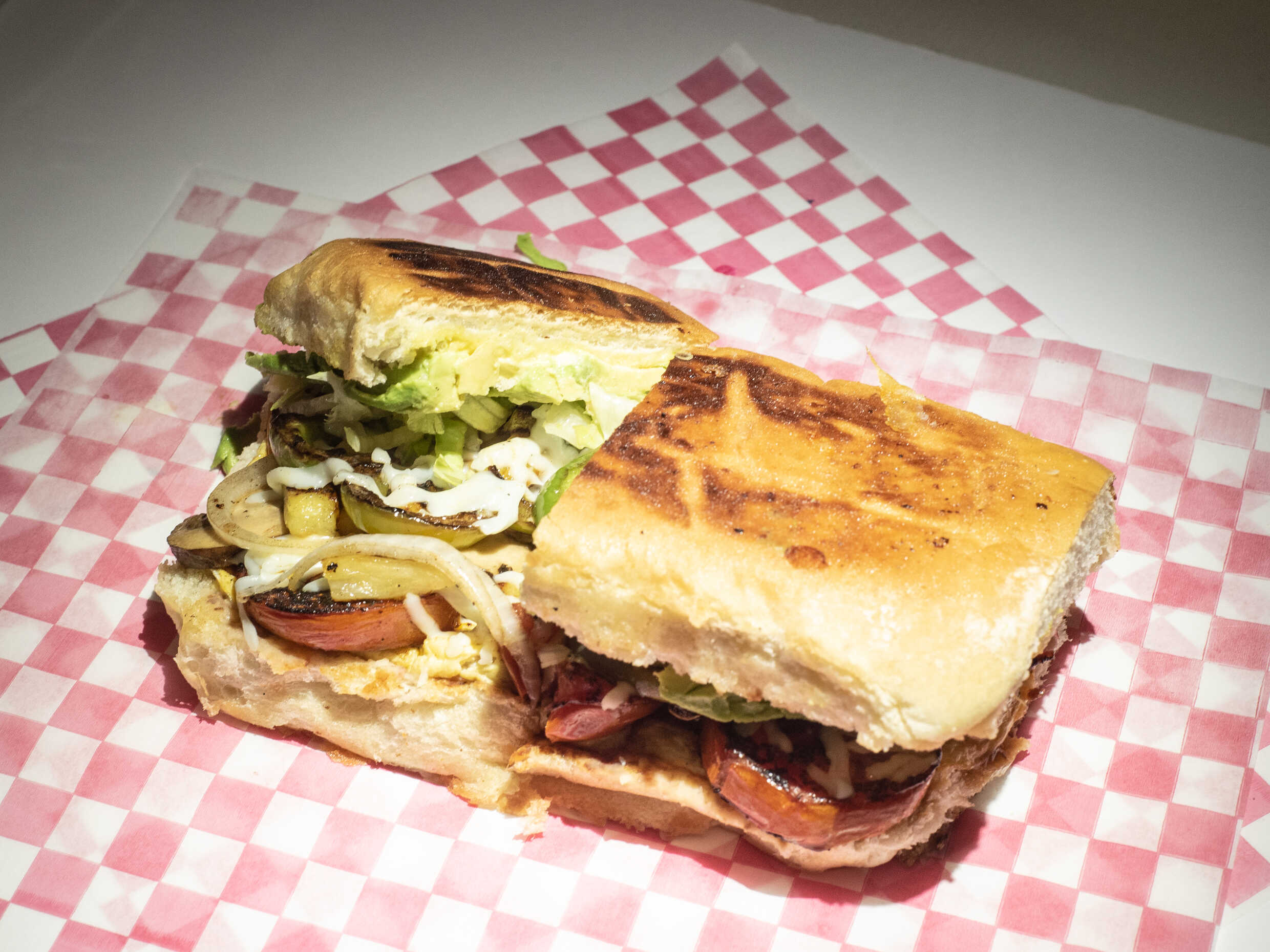 Pan telera, tomate sazonado a la plancha, frijolitos, quesillo Oaxaca, piña, champiñón, chile morrón, cebolla, lechuga, aderezo y salsa de la casa.